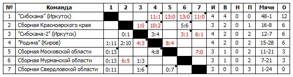 Подмосковная команда смогла противостоять сибскановской команде только в первом тайма, когда достаточно неплохо отработала в обороне. Тем не менее, и в первой половине встречи преимущество «Сибсканы» было внушительным, что отразилось в четырех забитых мячах. А после перерыва бело-зеленые добавили еще, и мячи в ворота соперниц полетели один за другим. Итог – 13:0 в пользу иркутянок, в составе которых отличилась Татьяна Гуринчик, которая забила в этой встрече четыре мяча.